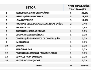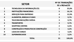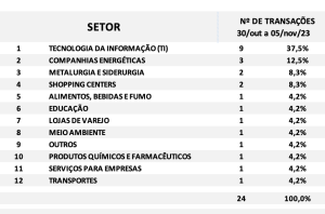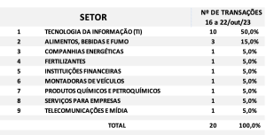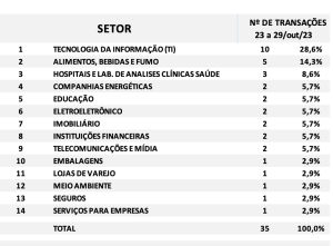Fusões e Aquisições – resumo da semana 23 a 29/out/2023 19 de novembro de 202319 de novembro de 2023 Portal de Fusões e Aquisições Divulgadas 35 operações de Fusões e Aquisições com destaque pela imprensa na semana 23 a
