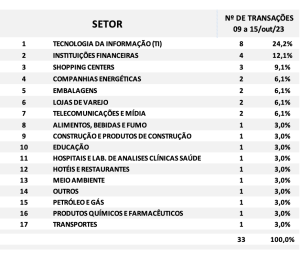 Fusões e Aquisições – resumo da semana 09 a 15/out/2023 12 de novembro de 2023 Portal de Fusões e Aquisições Divulgadas 33 operações de Fusões e Aquisições com destaque pela imprensa na semana 09 a