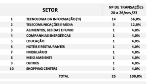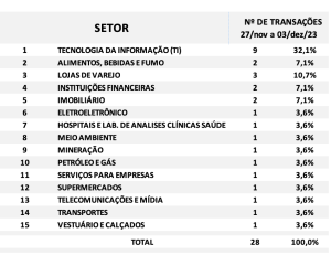 Fusões e Aquisições – resumo da semana 27/nov a 03/dez/2023 18 de dezembro de 2023 Portal de Fusões e Aquisições Divulgadas 28 operações de Fusões e Aquisições com destaque pela imprensa na semana 27/nov a