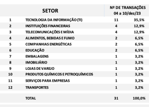 Fusões e Aquisições – resumo da semana 04 a 10/dez/2023 15 de janeiro de 2024 Portal de Fusões e Aquisições Divulgadas 31 operações de Fusões e Aquisições com destaque pela imprensa na semana 04 a