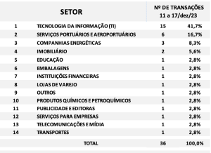 Fusões e Aquisições – resumo da semana 11 a 17/dez/2023 16 de janeiro de 2024 Portal de Fusões e Aquisições Divulgadas 36 operações de Fusões e Aquisições com destaque pela imprensa na semana 11 a